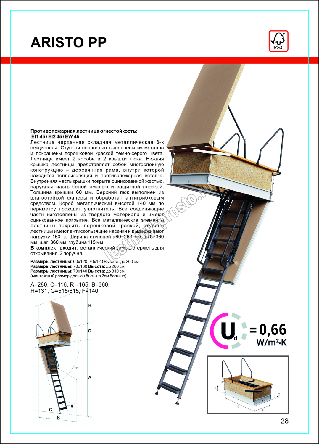 Противопожарная чердачная лестница с люком OMAN ARISTO PP 70х130 см, h-280 см |