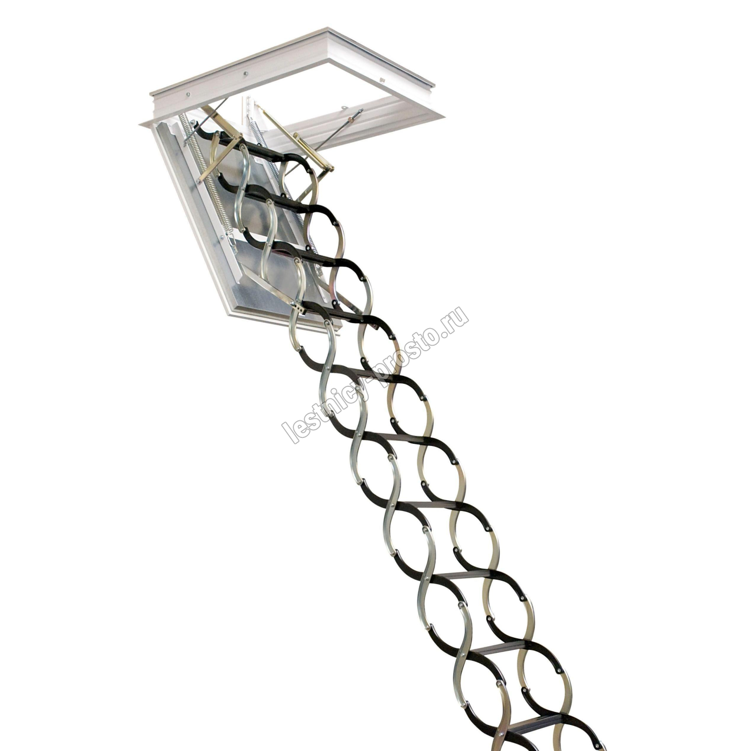 Сертифицированная, противопожарная лестница, огнестойкость: EI1 20 / EI2 60 / EW 60. Лестница чердачная, раздвижная, ножничного типа, работает по принципу сжатия. Крышка лестницы представляет собой многослойную конструкцию – деревянная рама, внутри которой находится теплоизоляция и противопожарная вставка. Внутренняя часть крышки покрыта оцинкованной жестью, наружная часть белой эмалью и защитной пленкой. Толщина крышки 60мм. Лестница предназначена для установки в утепленное чердачное помещение, где колебание температуры не превышает 10 градусов. Все соединяющие части изготовлены из твердого материала и имеют оцинкованное покрытие. Короб металлический высотой 140мм. по периметру проходит уплотнитель.