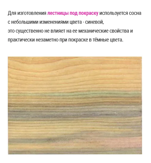Для изготовления лестницы под покраску используется сосна с небольшими изменениями цвета - синевой, такой допустимый порок древесины существенно не влияет на ее механические свойства и практически незаметен при покраске в тёмные цвета.