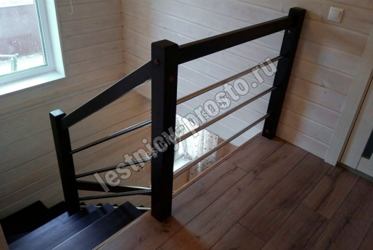 В комплекте: 3 прямых деревянных столба без какого-либо покрытия и профильный поручень без покрытия, комплект из 3 ригелей из стали (окрашены в цвет каркаса или хром по желанию) диаметром 12 мм., необходимая фурнитура.