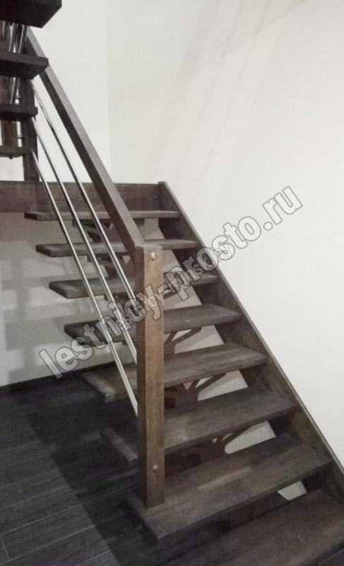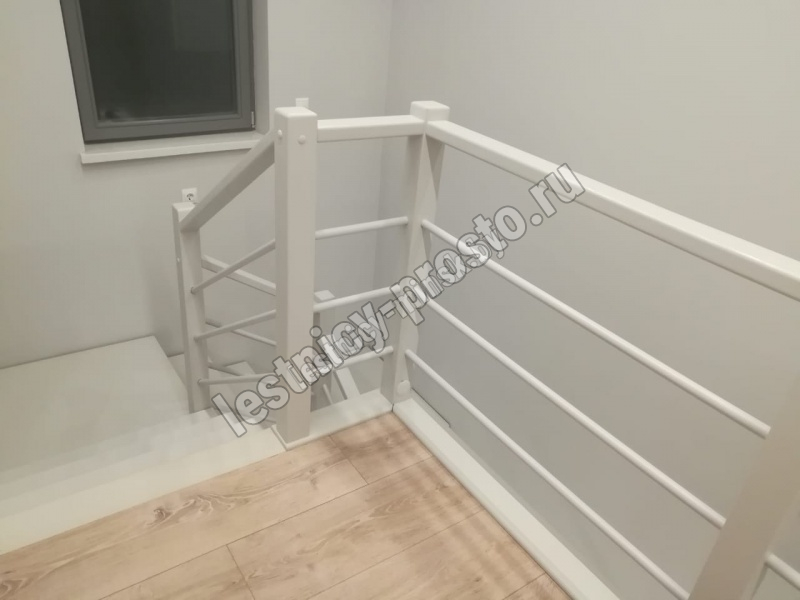 В комплекте: 3 прямых столба и профильный поручень без покрытия, набор из 3 ригелей из стали (окрашены в цвет каркаса или хром по желанию) диаметром 12 мм. Ограждение начинается со второй ступени.