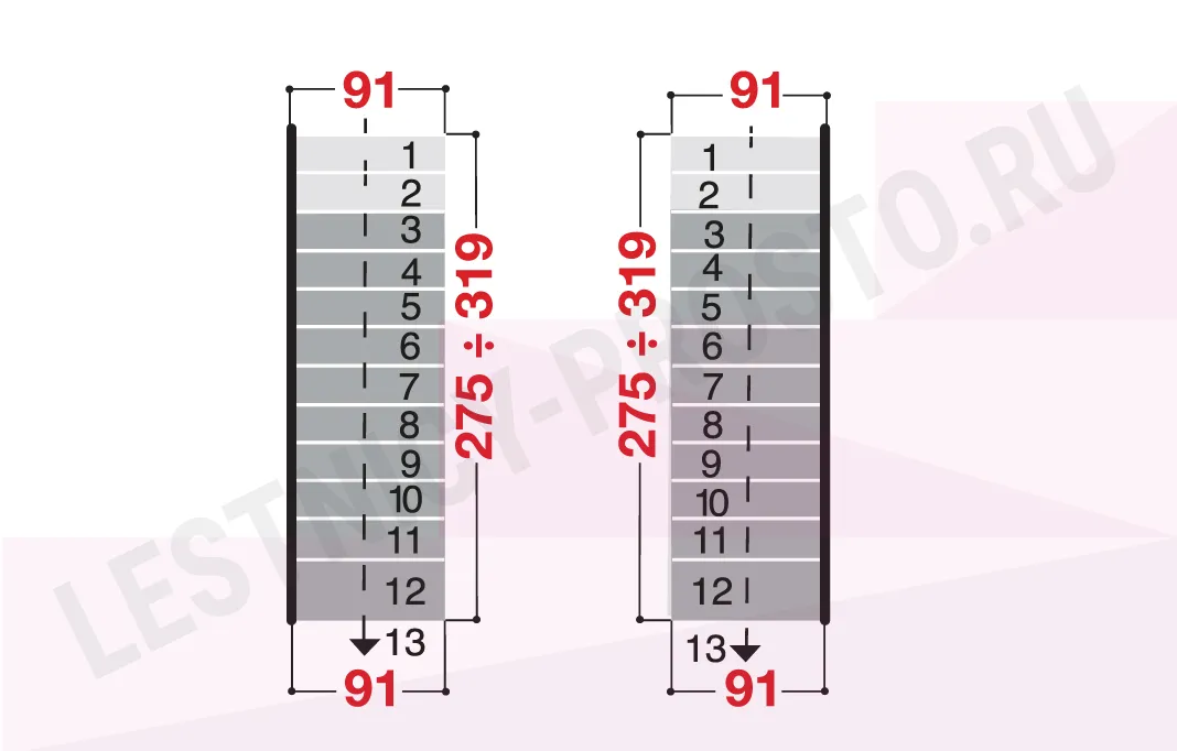 При монтаже этой лестницы, возможно регулировать высоту и глубину шага, таким образом можно получить лестницу под высоты этажа в диапазоне 2250 - 3030 мм, кроме того, установив дополнительный комплект увеличения высоты, можно поднять высоту лестницы до 3730 мм. Ширина проступи регулируется при монтаже в пределах 180 - 220 мм. Каркас и стойки ограждения выполнены из пластифицированного металла.