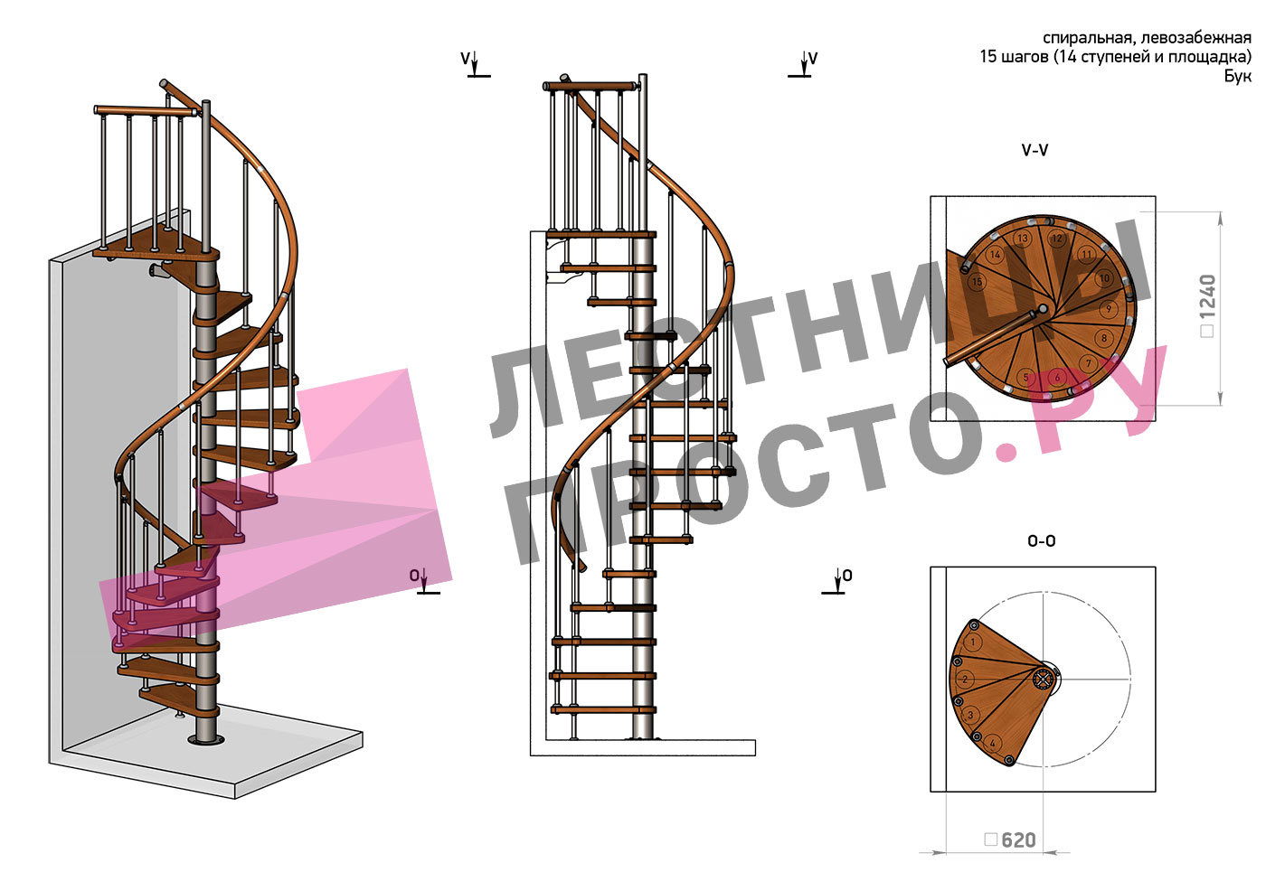 Левая, d=120см, 14 ступеней + площадка