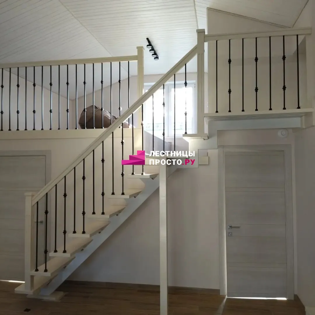 Деревянная лестница с поворотом из сосны для частного дома